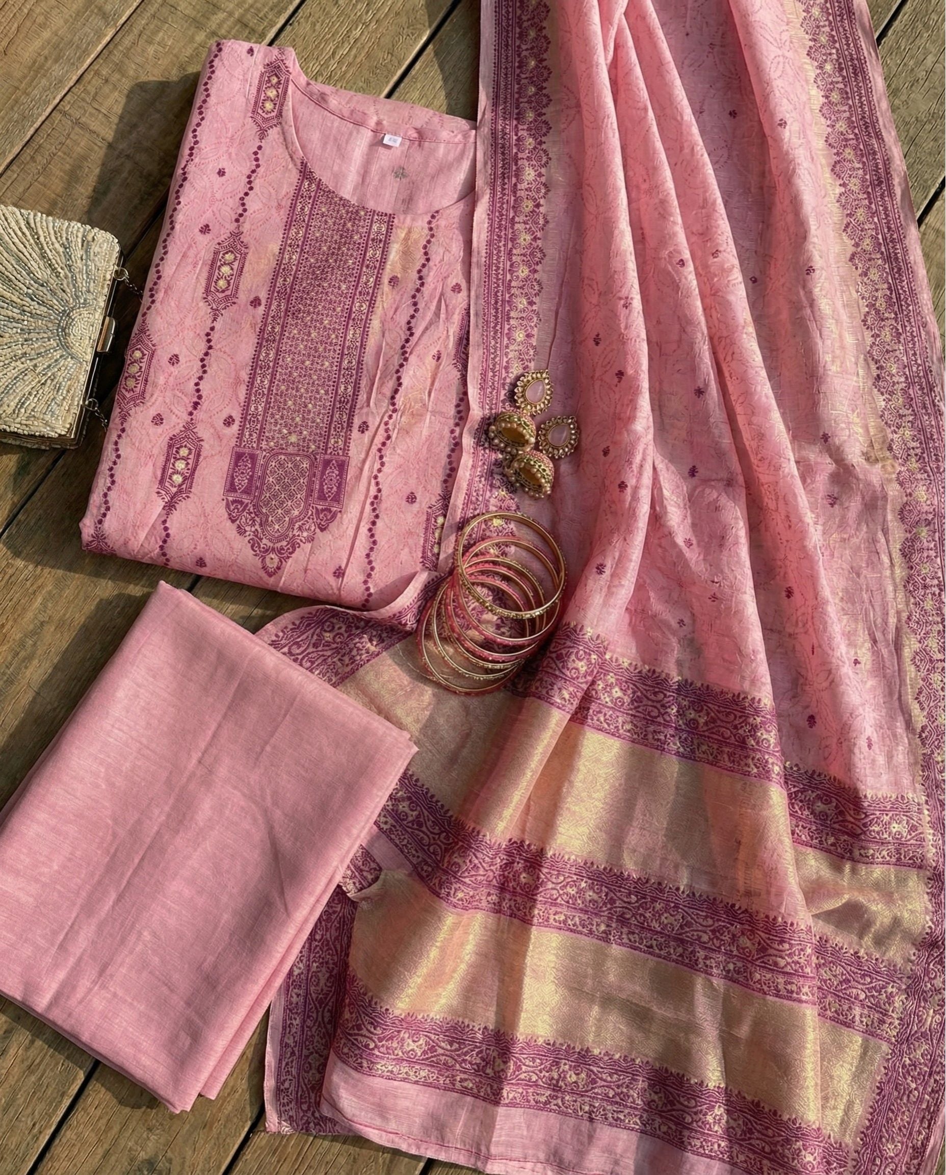 A soft and graceful unstitched suit set made for festive days, family gatherings, daytime functions, and calm celebrations. The pastel pink base paired with deep woven motifs and zari detailing gives a rich look without feeling heavy. The pure cotton fabric stays breathable and comfortable, making it a strong choice for warm weather and long wear.