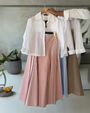 Skirt: High-waist, flowy pleated design. Full-length with elegant movement. Matte finish in soft, wearable tones. Lightweight and all-day comfy.